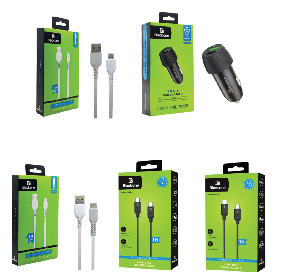عرض بلاك ون مكون من 4 كيابل باللون الابيض وراس شاحن سياره لون اسود