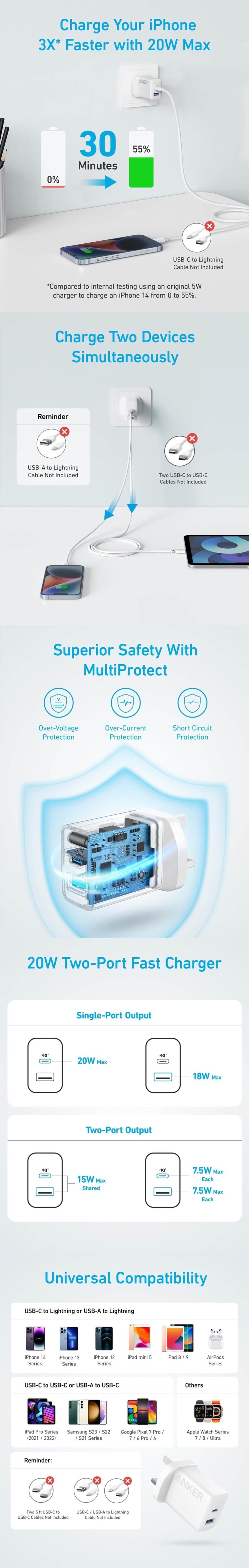 شاحن جداري انكر بقوة 20 واط بمنفذ تايب سي ومنفذ يو اس بي